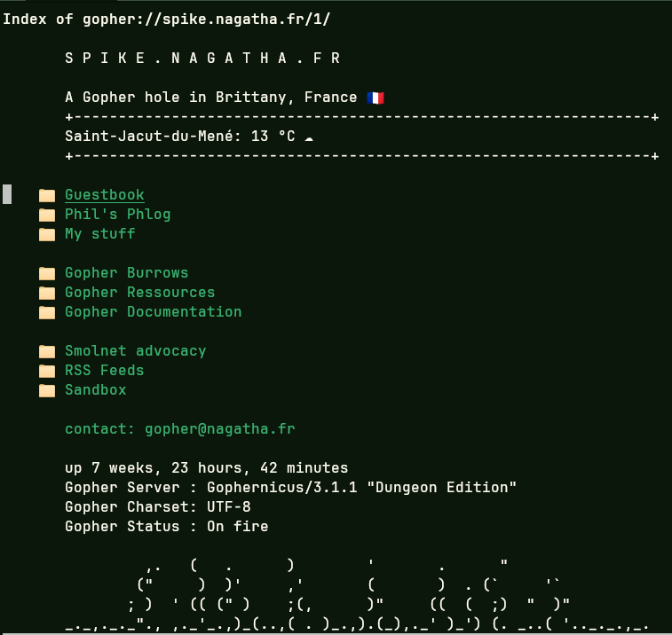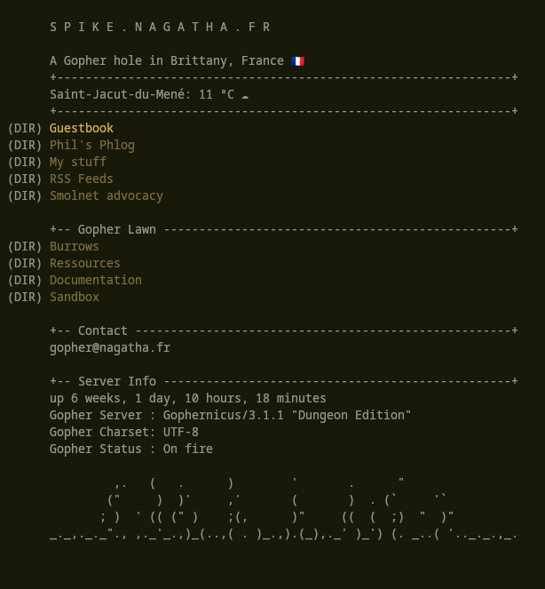 Gopher non ha JavaScript, cookie, CSS o tag di formattazione che possano rovinarti la giornata; solo contenuto e link chiaramente definiti. La sua semplicità è intenzionale, e proprio per questo è il trampolino ideale verso altri protocolli dello smolnet come gemini://, spartan:// e molti altri. Non sei obbligato a vivere per sempre al servizio degli interessi delle grandi corporazioni. Là fuori c’è un mondo tutto da scoprire!
