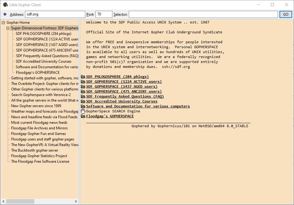 Gopher è uno dei protocolli della smolnet che sta vivendo una nuova ondata di interesse a causa dell'oppressione della web da parte degli interessi corporativi, dalla spazzatura prodotta dall’IA e dell'eccessiva complessità, dove i tuoi dati personali fanno guadagnare denaro ad altri e tu diventi il prodotto. Gopher è una soluzione semplice, affidabile e collaudata, in testo semplice, che può fornire testi, immagini, documenti, video, audio, streaming, ecc., e può collegarsi a quasi qualsiasi altro protocollo, purché il tuo client o browser lo supporti.
